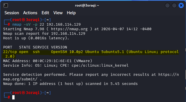 nmap -sV -p {target ip}تم تنفيذ فحص على المنفذ 22/tcp باستخدام الخيار -sV للكشف عن إصدار الخدمة على الجهاز المستهدف