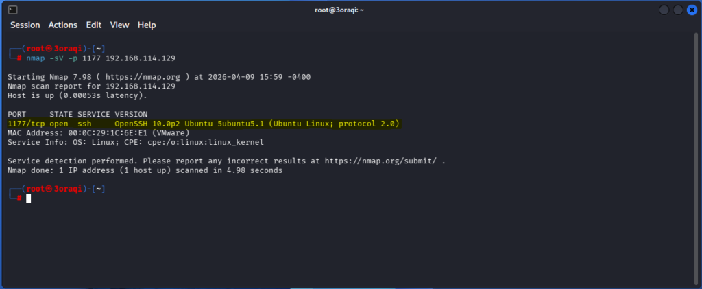 بعد حفظ التغييرات في الملف، يُظهر التعداد الذي تم إجراؤه باستخدام كالي لينكس الآن خدمة SSH تعمل على رقم المنفذ الجديد 1177.