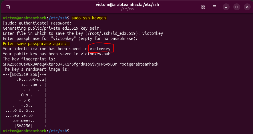يمكن إنشاء زوج المفاتيح العام والخاص باستخدام أداة ssh-keygen داخل جهاز أوبونتو. يتم أيضًا تعيين عبارة مرور (passphrase) لمفتاح id_rsa بحيث عندما يقوم المستخدم بتسجيل الدخول باستخدام المصادقة القائمة على المفتاح، سيُطلب منه أيضًا عبارة مرور. بشكل افتراضي، المسار لتخزين id_rsa و id_rsa.pub هو مجلد .ssh في الدليل الرئيسي للمستخدم، أي /home/pentest/.ssh/id_rsa.