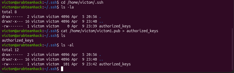 داخل الشل الأولي الذي تم الحصول عليه سابقًا، سنقوم باستبدال ملف authorized_keys داخل دليل .ssh الخاص بالمستخدم victom.