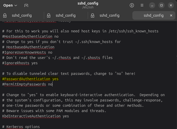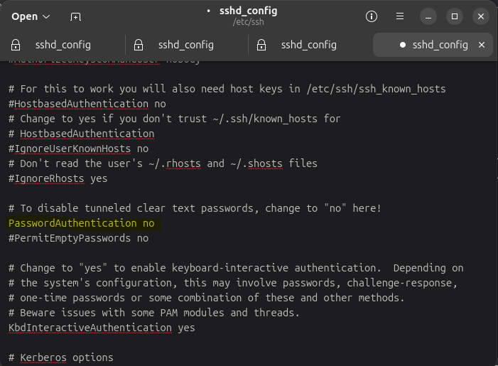 بعد ذلك، يمكننا تعطيل المصادقة القائمة على كلمة المرور في ملف /etc/ssh/sshd_config. يوجد سطر معلق #PasswordAuthentication بقيمة yes.