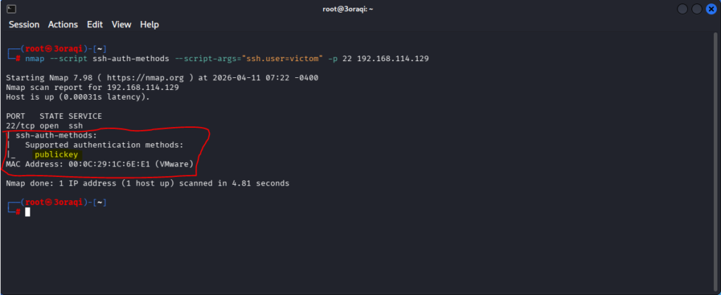 يتم إعادة تسمية ملف loot إلى key لتسهيل الاستخدام، ويتم تعيين الصلاحيات إلى 600 (وهو مطلوب من قبل عميل SSH)، ويتم استخدام المفتاح للمصادقة دون أي كلمة مرور. يوضح هذا كيف يمكن لجلسة Meterpreter واحدة أن تمنح وصولاً دائمًا ومستقلًا عن كلمة المرور إلى الهدف حتى بعد تعطيل مصادقة كلمة المرور لاحقًا.
