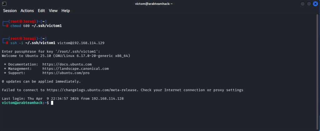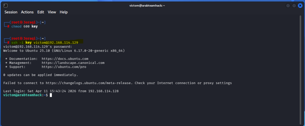 لنفترض سيناريو حيث يمكننا بطريقة ما الحصول على المفتاح الخاص لمستخدم Ubuntu، عندها يمكننا تسجيل الدخول مباشرة باستخدام المصادقة القائمة على المفتاح. ومع ذلك، يجب علينا منح المفتاح الخاص صلاحية القراءة والكتابة للمالك فقط، ولكن يجب أن نأخذ الحيطة بعدم منح المفتاح صلاحيات زائدة. لمنح الصلاحيات المناسبة، سنستخدم الأمر التالي: