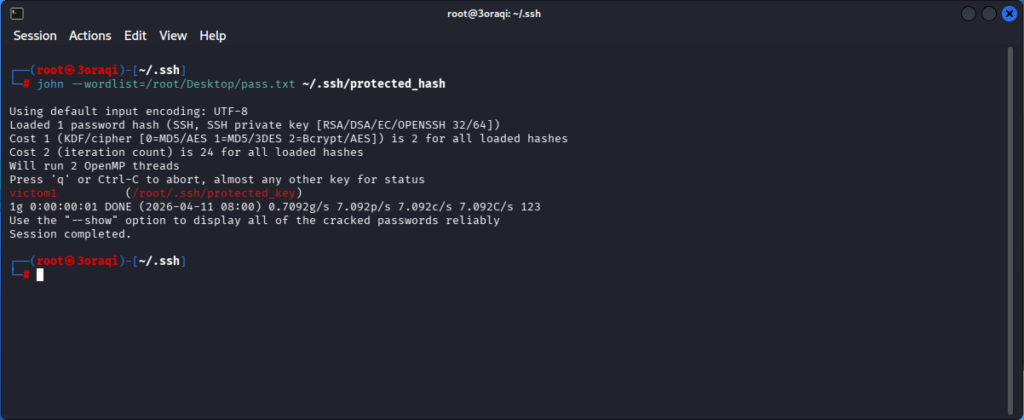 ssh2john [yourfile] > sshhashيقرأ ssh2john ملف المفتاح الخاص (victom1)، ويستخرج الكتلة المشفرة للمفتاح، ويكتبها إلى ملف (sshhash) بتنسيق التجزئة الخاص بـ John. يبدو الملف الناتج مثل مدخلات John القياسية مع معرف المفتاح كحقل اسم المستخدم.