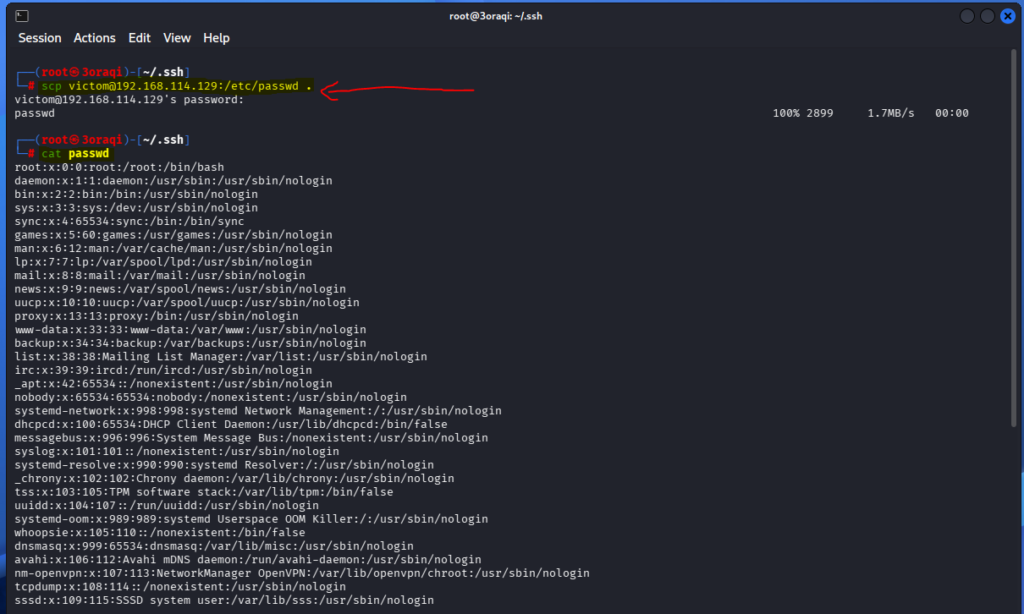 بعكس ترتيب الوسائط، يقوم بسحب الملفات من الهدف إلى المهاجم. هنا يقوم المهاجم بنقل ملف /etc/passwd — وهو ملف حاسم يحتوي على جميع أسماء مستخدمين النظام ومعرفات المستخدمين (UIDs) ومعرفات المجموعات (GIDs) والأدلة الرئيسية: