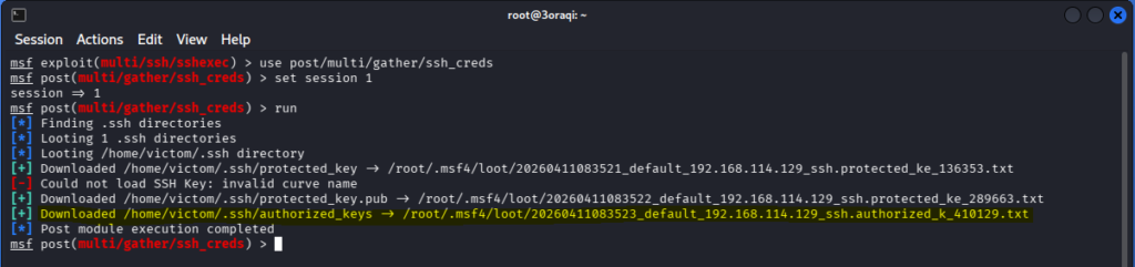 قامت وحدة post/multi/gather/ssh_creds بتنزيل protected_key و protected_key.pub و authorized_keys من /home/victom/.ssh/.