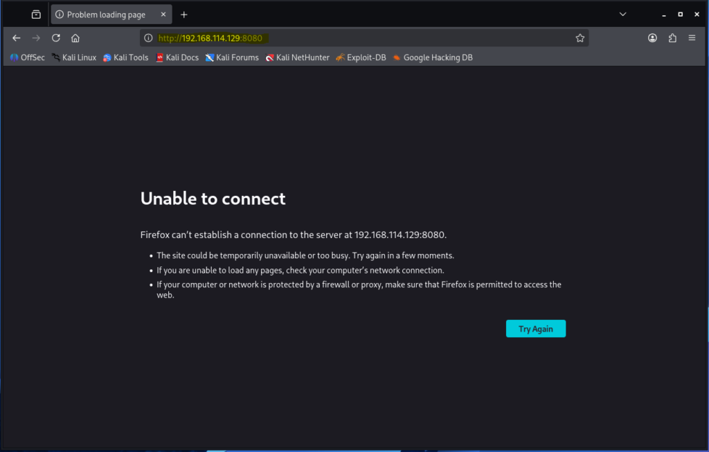 يمكن رؤية أدناه أن التطبيق الذي يعمل داخليًا على جهاز أوبونتو لا يمكن الوصول إليه مباشرة من جهاز الكالي الخاص بنا.
