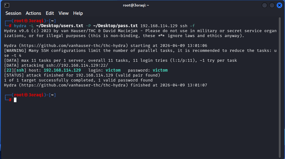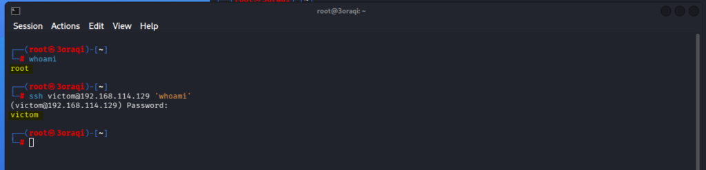بعد الحصول على اسم المستخدم victom وكلمة المرور victom، يمكن للمهاجم الآن المصادقة إلى خدمة SSH باستخدام الأمر التالي:
