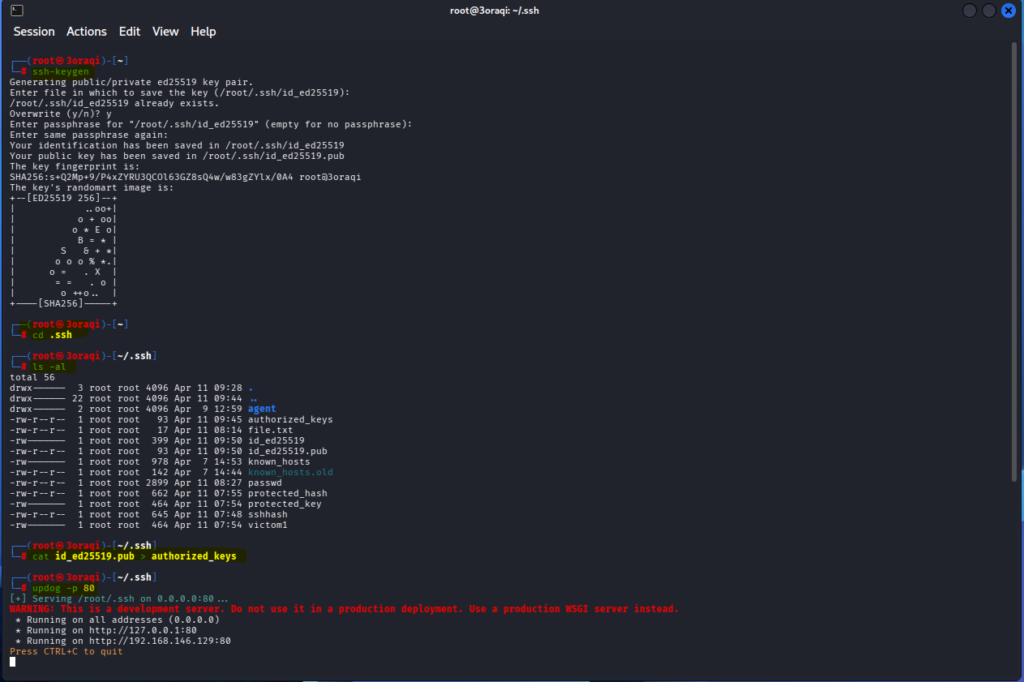 هنا نقوم بإنشاء مفتاح SSH محليًا على جهاز كالي، وبما أن لدينا وصول أولي بالفعل، فمن الأفضل نسخ المفتاح العام لمستخدم root في كالي إلى ملف authorized_keys على نظام أوبونتو.