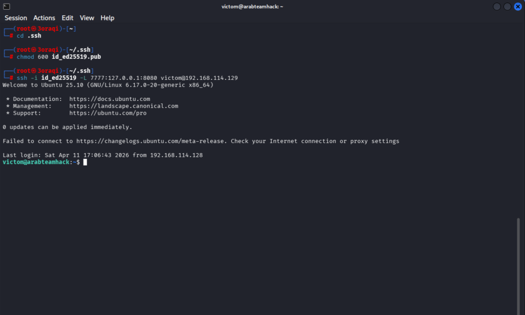 تم استخدام scp -i victom1 لنقل المفاتيح و ssh -L 7777:127.0.0.1:8080 للوصول إلى تطبيق الويب.