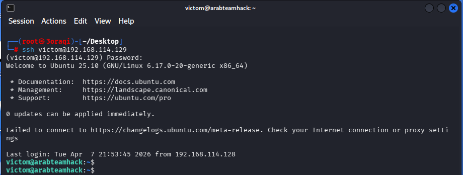 هذا الدليل الموسع وثق دورة الحياة الكاملة لاختبار اختراق SSH متطور — بدءًا من اكتشاف الخدمة الأولي مروراً بـ 25 خطوة متميزة للهجوم والدفاع. أظهر المختبر أن كلمة مرور ضعيفة واحدة (victom) هي السبب الجذري لكل هجوم تلا ذلك: التخمين لبيانات الاعتماد، جلسات Meterpreter، نقل البيانات، جمع بيانات الاعتماد، والوصول الدائم عبر المفاتيح المسروقة — كلها تعود إلى ذلك الفشل الواحد.