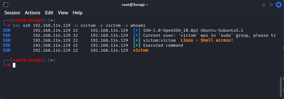 يمكن لـ NetExec تنفيذ أوامر مفردة عبر اتصال SSH موثق دون فتح غلاف تفاعلي. هذا مفيد لجمع البيانات السريع وغير التفاعلي:
