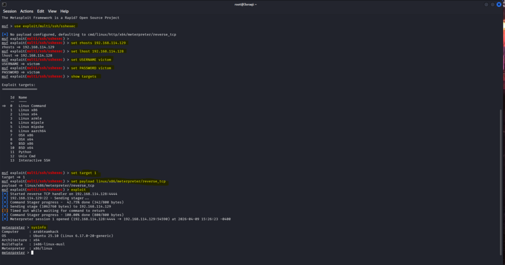 Meterpreter عبر Metasploit باستخدام multi/ssh/sshexec