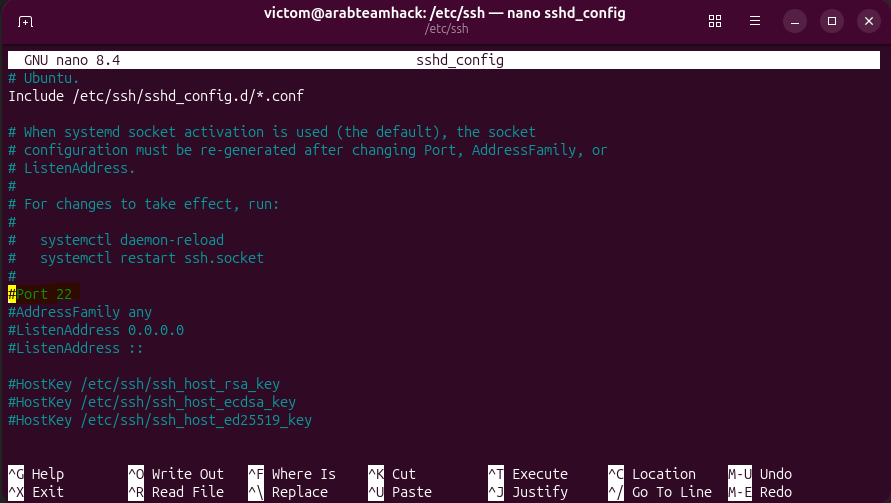 nano sshd_configيمكن رؤية المنفذ الافتراضي هنا على أنه 22 في السطر المعلّق.