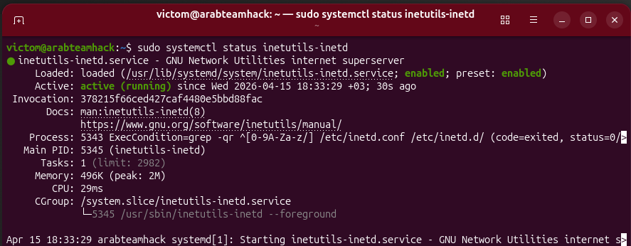 systemctl status inetdومع المخرجات الموضحة في لقطة الشاشة، يمكننا ملاحظة أن الخدمة نشطة في أوبونتو.