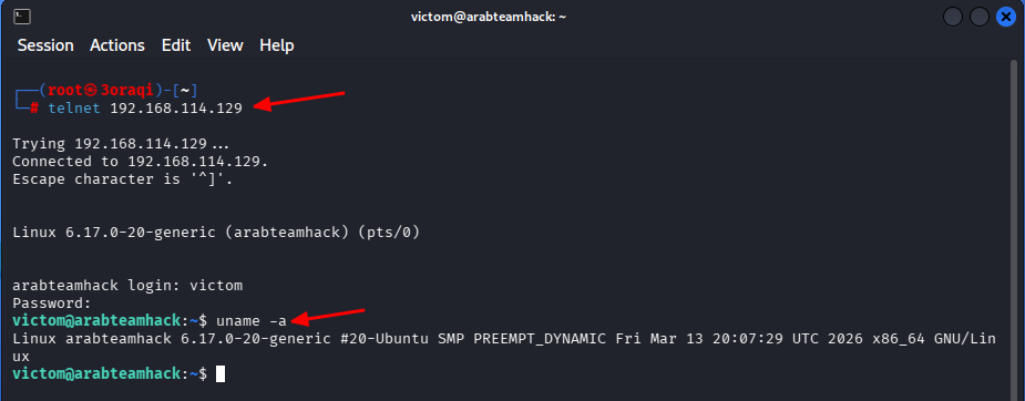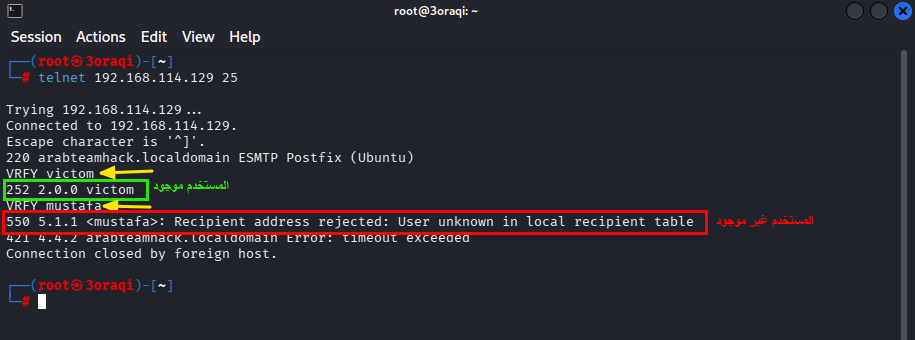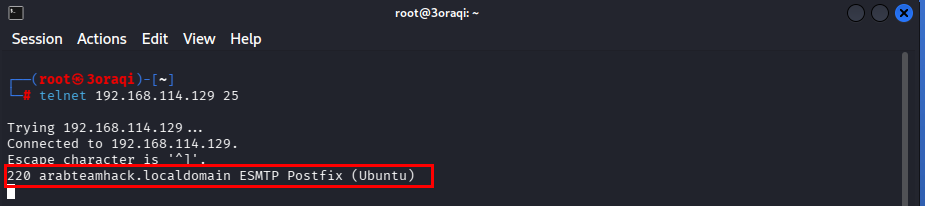 ستلاحظ من الصورة أنه تم تحميل “220 arabteamhack.localdomain ESMTP Postfix (Ubuntu)” بنجاح على جهاز الهدف.