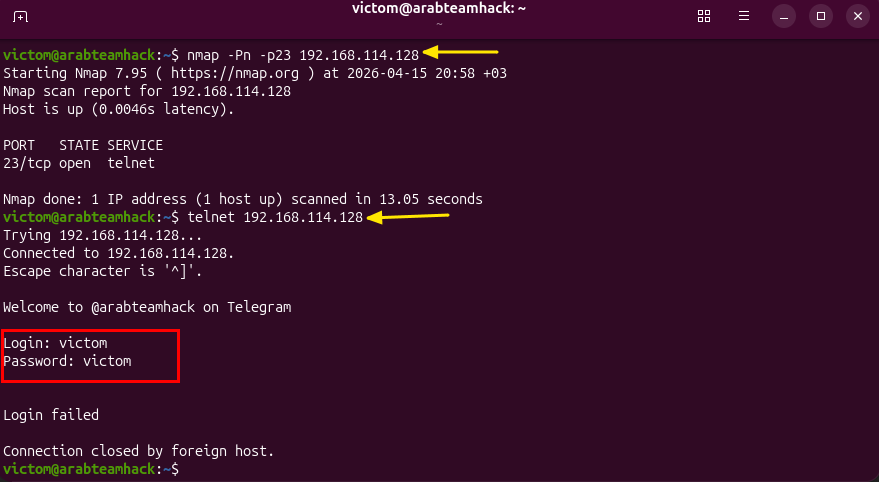 الآن بمجرد أن يكتشف المهاجم أن خدمة تيلنت تعمل على نظام الضحية، يحاول الاتصال بها، ولكي يتمكن من الاتصال يقوم بإدخال بيانات الدخول (اسم المستخدم وكلمة المرور) ولكن يفشل تسجيل الدخول.