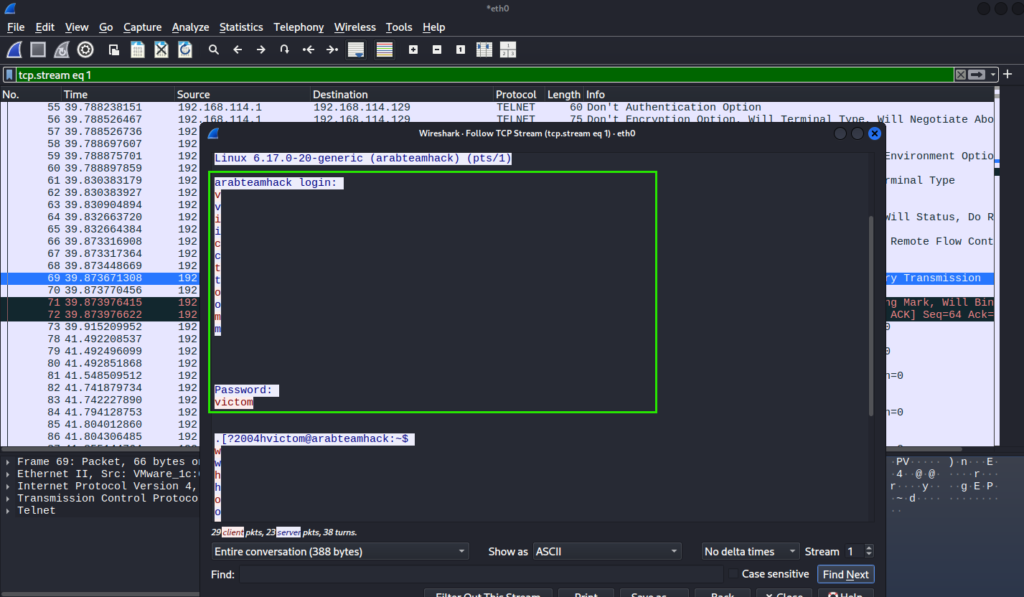 من الصورة أدناه يمكنك قراءة اسم المستخدم: victom وكلمة المرور: victom الخاصة بتيلنت، بالإضافة إلى المعلومات الكاملة التي تنتقل عبر الحزمة بين المصدر والوجهة.